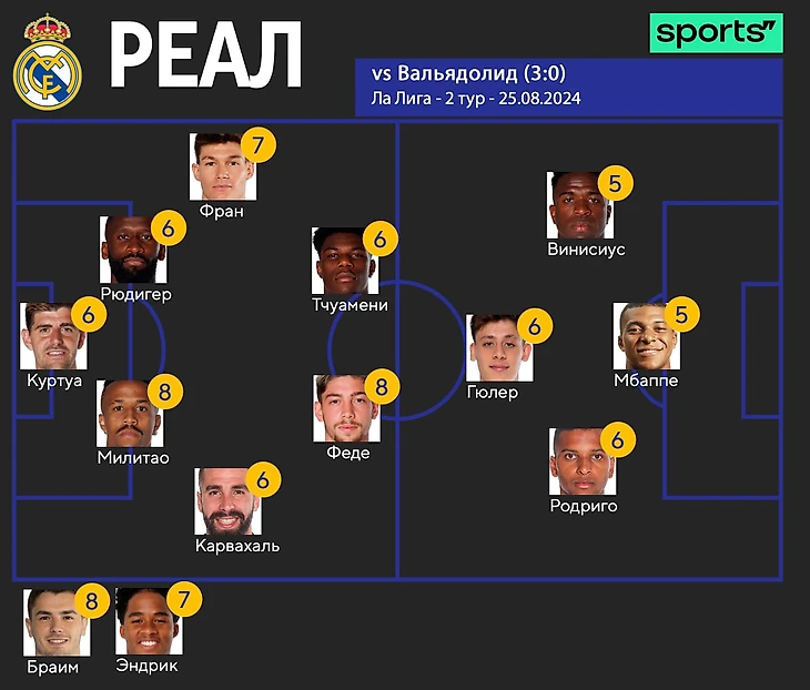 Арда Гюлер – 6. Не понравился в первом тайме. Много суетился и не пытался играть вперед, опасности от него почти не исходило. Во втором тайме Арда заиграл совершенно иначе и охотно пользовался свободными зонами. Трижды выходил на ударные позиции и каждый раз мог забивать, но где-то не повезло, а где-то сам неудачно подстроился под удар. Игру Гюлер точно не провалил, но и вряд ли добавил дополнительных очков в пользу своей кандидатуры на стартовый состав. Но переживать об этом не стоит: Анчелотти уже заявил, что и Гюлер, и Эндрик будут регулярно получать минуты.