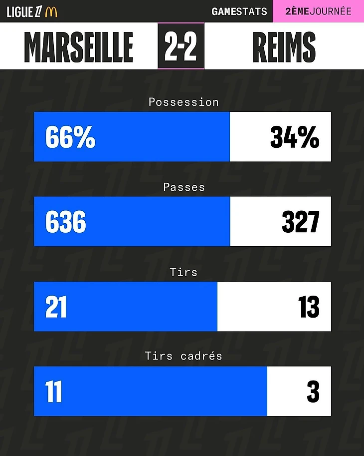 «Марсель» продолжал пытаться взломать шесть защитников «Реймса», но «красно-белые» прекрасно справились с натиском «провансальцев». 2:2 на табло, и «Марсель» теряет очки, несмотря на отличную игру в первом тайме. Статистика матча говорит сама за себя.