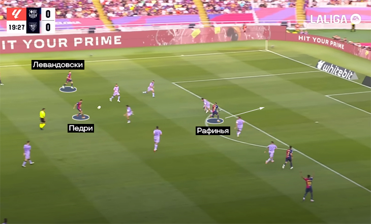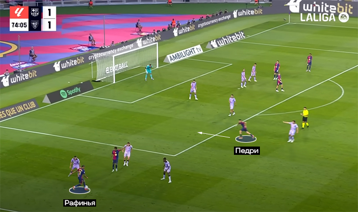 Это еще не все. После перерыва Рафинью перевели на левый фланг, а в центр вышел Фермин. Рафа адаптировался и перегружал зону, освобождал пространство и включал Педри, как в эпизоде со вторым голом.