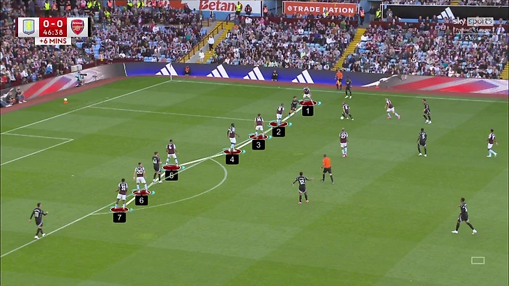 «Арсенал» испытывал проблемы против «Астон Виллы» при 0:0. Команда Унаи Эмери была ближе к голу и почти безупречно оборонялась: прекрасно перекрывала центр в среднем блоке, а на своей половине стремилась контролировать все варианты в последней линии. Из-за этого возникали совсем радикальные ситуации – например, семь защитников: