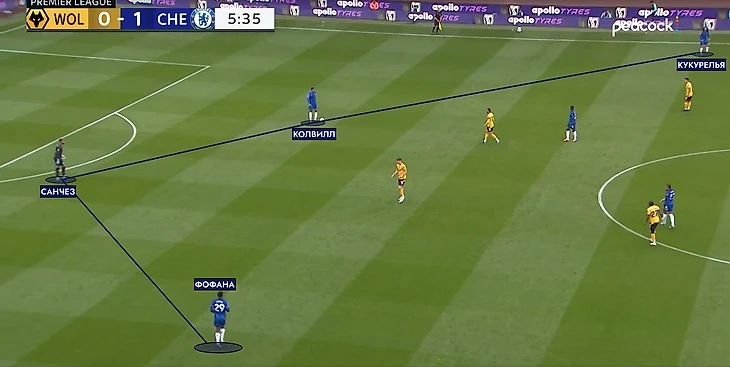 1. «Синие» пробовали «растягивать» линию полузащиты хозяев широкими позициями защитников – на скрине выше заметно, насколько нетипично видеть большое расстояние от Колвилла до Куку и Фофана.
