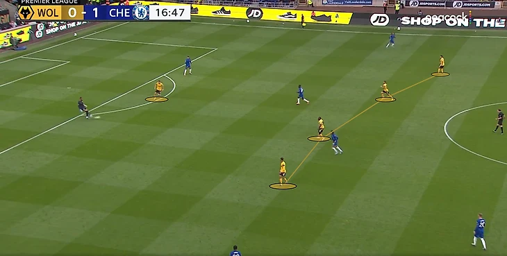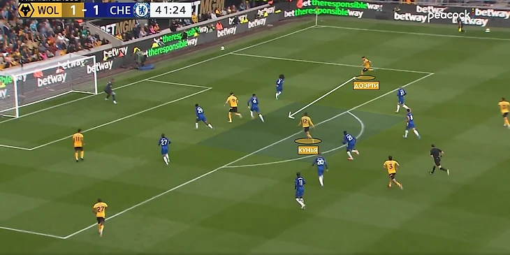 А теперь про оборонительный план «Вулвз». Стоит отметить, что после первого пропущенного гола изначальный план на игру мог немного видоизмениться. «Вулверхэмптон» играл довольно высоко, начиная прессинговать «синих» у ворот Роберта Санчеса. Как раз на чужой половине поля «волки» играли по схеме 4-1-4-1 с довольно компактным центром.