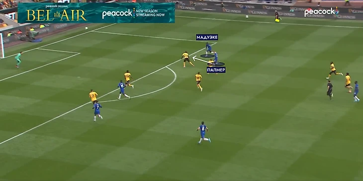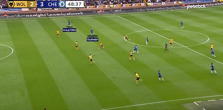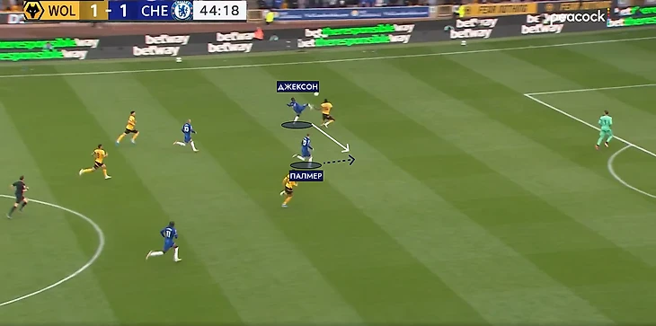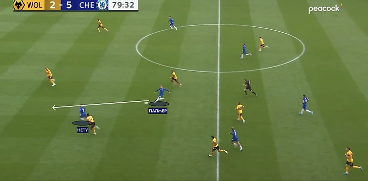 Но это не вся защитная структура. Немного заглянем вперед и увидим, что после ответного гола «Вулвз» перешел на более спокойные «4-2-3-1». Теперь давление было оказано на Энцо и Палмера.