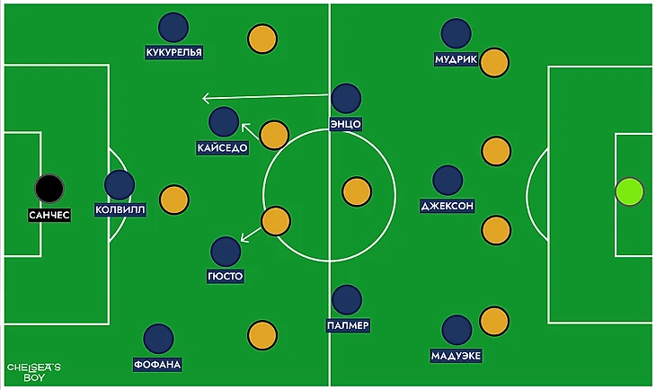 Сделано это было, чтобы оказывать большо давление на опорную зону «Челси» – Кайседо и инвертированного Гюсто. К тому же, если к билдапу «синих» подключали Роберта Санчеса (в прошедшей встрече он был полезен в этом аспекте), то в первую линию выбегал Кунья, оказывая большее давление на кипера и защитника.