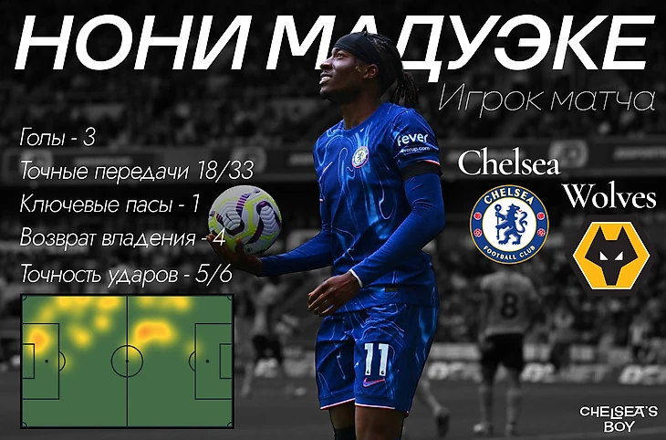 Лучшим игроком матча стал Мадуэке. Все-таки Нони не каждую игру кладет хет-трик, плюс пару таких же заходов в первом тайме приносили свои плоды (заработанный результативный угловой). Но также ярко выделился Коул Палмер. Думаю, время англичанина еще придет.