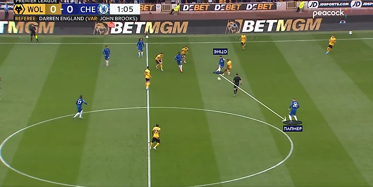 1. Борьба в воздухе от Колвилла и передача Кайседо на Энцо. Мойзес отлично разобрался в ситуации, когда на эквадорце висели два футболиста «Вулвз».
