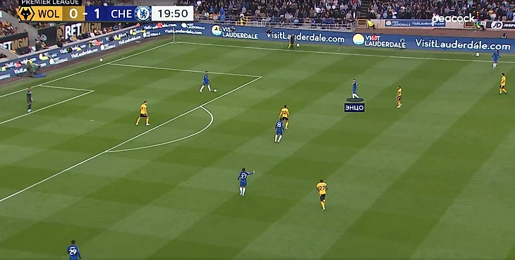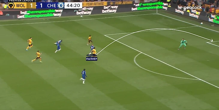 2. Разрывы между линиями в обороне «волков». Благодаря тому, что «Челси» поймал хозяев на переходной стадии (выход из обороны в атаку), у «Вулверхэмптона» осталось большое количество свободных зон для передач. На первом скрине видно, что у Энцо после приема будет достаточно времени, чтобы быстро развернуться и отдать передачу. Аналогично у Палмера, только Коулу хватило времени не только принять мяч, но и развернуть корпус и отдать пас на Нони. Далее, Мадуэке зайдет в штрафную, и сможет ударом с правой ноги заработать угловой.