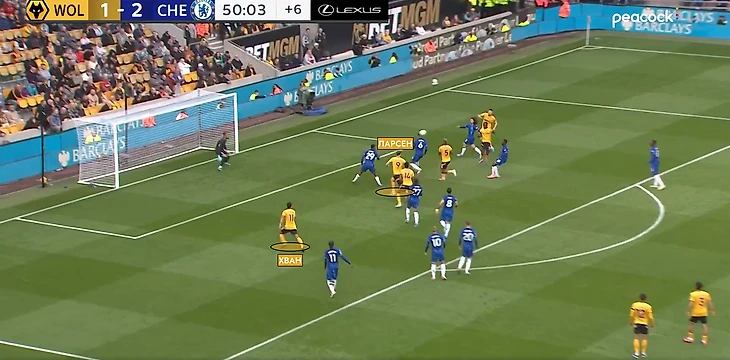 По занавес первого тайма «Вулвз» создает еще один прецедент у ворот «Челси». Кукурелья решил поддержать Фофана и тоже не доглядеть за свои флангом. Итог – Лемина выдаст классную передачу на Доэрти, а Мэтт прострелит в 14-ую зону, где окажется ровно ноль футболистов в синей форме. Опять по новой.