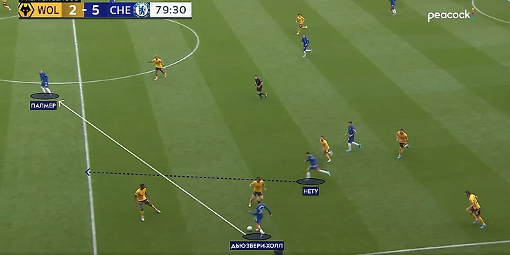 Кирнан отведет опасность с фланга, отдав пас на свободного Коула Палмера. К этом моменту, Нету не выключается, а продолжает движение в сторону ворот.