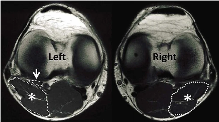 Вот, например, картинка из исследования турецких специалистов, где взяли срез МРТ 2 коленных суставов, где мы смотрим на них как бы сверху. Вверху это надколенник, коленная чашечка, снизу икроножная мышца. Что мы видим под стрелочкой? Слева мышца есть, а справа уже нет. То есть, чтобы поставить этот диагноз мышцу надо еще найти.