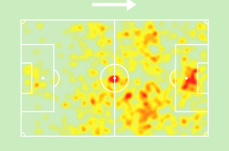 Если мы посмотрим на тепловую карту Матео, то можем заметить что он не 100% времени матча играл в створе ворот, а помогал в подыгрыше и прессинге.