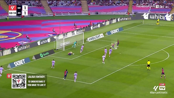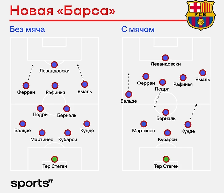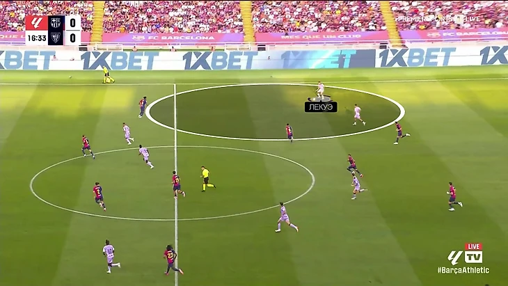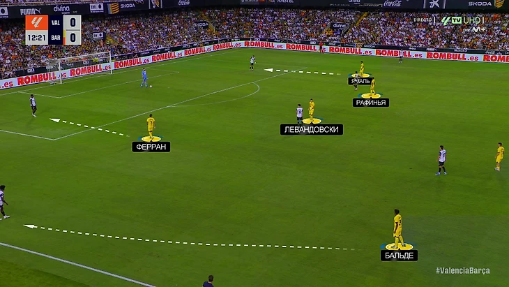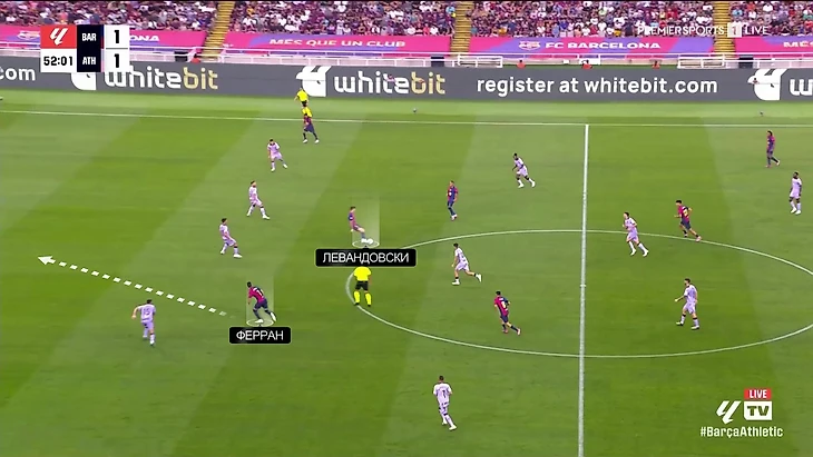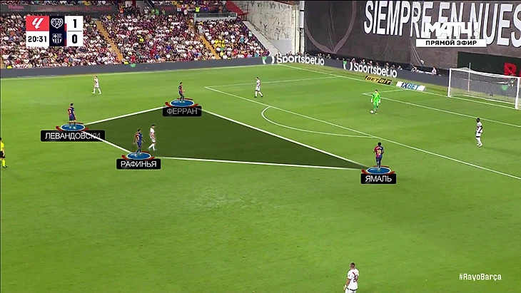 Такое расположение – базис. Внутри включаются интересные дополнительные перестроения – Ферран может быть вторым форвардом, оставляя Педри больше пространства в опорной; десятки могут меняться местами друг с другом; Кунде по ходу эпизода идет в атаку, отвлекая внимание от Ямаля; Рафинья любит делать рывки на правый фланг, когда Ямаль его освобождает или когда ему нужна помощь; Левандовски опускается глубже, а в обратном направлении рывок делает Рафинья или Ферран.