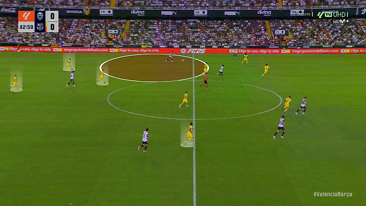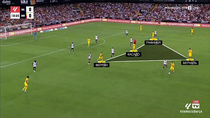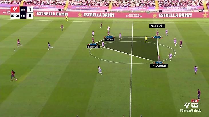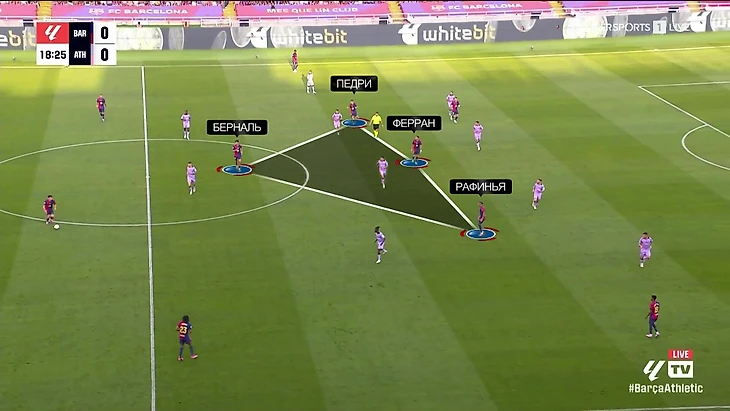 Главное изменение в структуре владения – заполнение центра. При Хави команда выстраивалась в 3-2-4-1 – схема с квадратом в центре. Теперь базовое расположение в этой зоне – один опорник плюс три игрока в чужой опорной (три десятки?). Глубинным опорником в первых встречах почти всегда был Марк Берналь, а пространство в центре занимали Рафинья, Ферран, Педри (или Касадо):