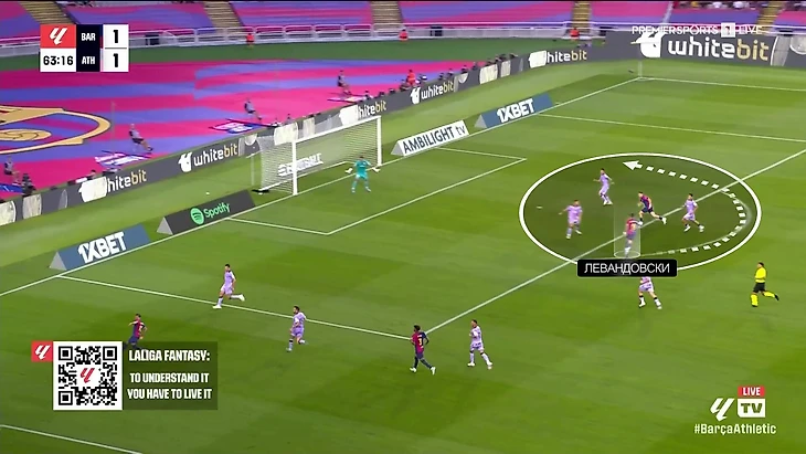 В зоне подачи три оппонента против двух игроков «Барсы» – Левандовски открывается по дуге, хитро сталкивая соперников, и оказывается полностью свободным перед ударом.
