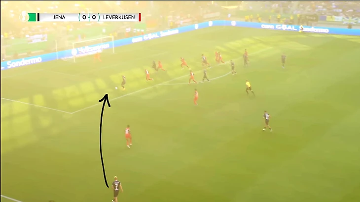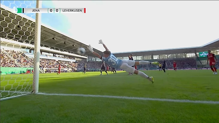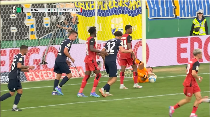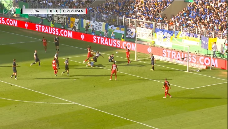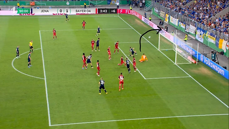 Когда хозяевам удавалось отобрать, то они старались сразу же организовать свою атаку. Такая возможность появилась после того, как «Карл Цейсс» заработал штрафной удар. Эрик Вайнхауэр решил разыграть стандарт, отдав передачу ближнему игроку. Им оказался Нильс Бутцен. Немец прострелил в штрафную «Байера».