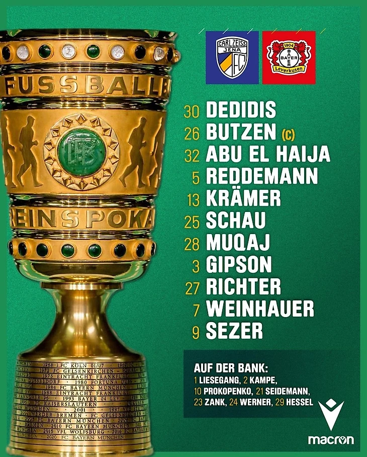 Хеннинг Бюргер выставил следующий состав по схеме 4-4-2: Алексиос Дедидис в воротах «Карл Цейсса». Четвёрка защитников - Нильс Бутцен, Халид Эль-Хаиджа, Сёрен-Курт Реддеман, Пауль Кремер. Полузащита: Кен Гипсон, Хамза Мукай, Юстин Шау и Йоэль Рихтер. Двое нападающих - Эрик Вайнхауэр и Джемал Сезер.
