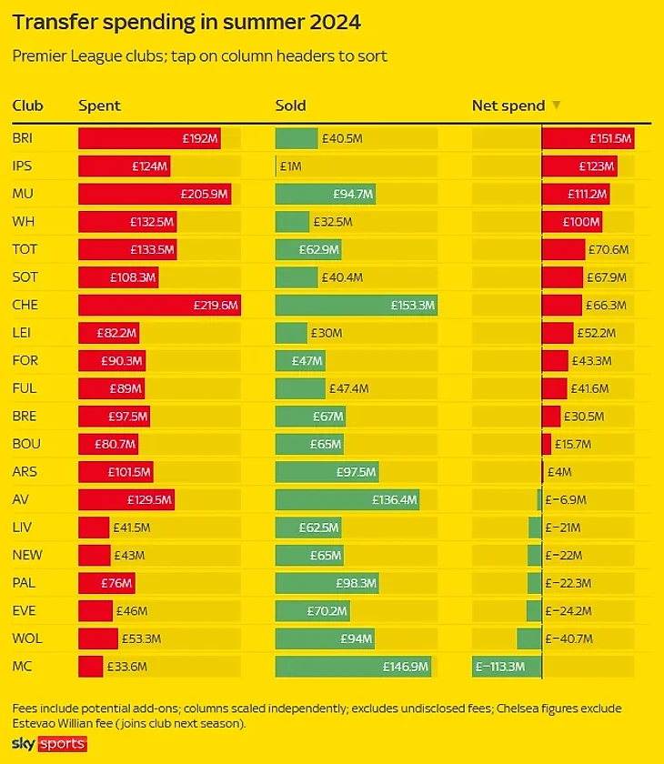 Британский телеканал Sky Sports по итогам летнего трансферного окна сезона-2024/25 сделал удобную инфографику трат клубов АПЛ. И в ней есть на что обратить внимание.