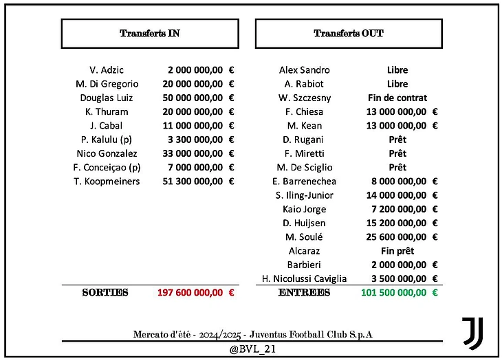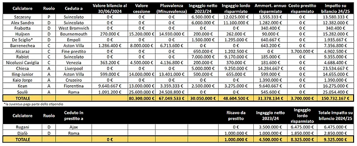 Операции по продажам должны иметь, по оценкам Calcio e Finanza, положительное влияние в размере около 160 миллионов евро для бюджета на 2024/25 год. Эту цифру можно достичь, сложив реализованные капитальные приросты/убытки, амортизацию (в случае игроков, проданных сразу) и сбережений на валовой стороне для игроков, которые покинули команду, по сравнению с сезоном 2023/24.