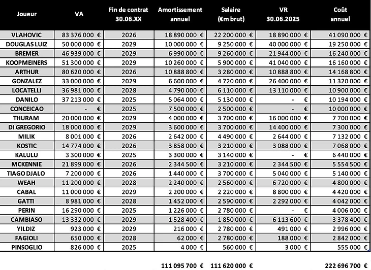 С учетом череды продлений контрактов действующих игроков, прихода новичков и продажи ликвидных активов, на текущий момент валовая стоимость всех текущий контрактов «Юве» составляет порядка 222 млн евро. В нее вошли затраты на трансфер каждого действующего футболиста при амортизации на оставшийся срок действия соглашений, их зарплата с налогом и действующая выплата по оставшимся обязательствам (так, все заключенные сделки с новыми игроками разбиты на 3-4 года платежей).