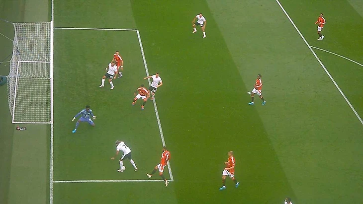 Опорная зона «МЮ», правда, не сильно изменилась и после замены Казе: 19-летний Майну и 20-летний Коллиер оставили вот такую дыру за пару мгновений до третьего, который забивал Мо Салах.