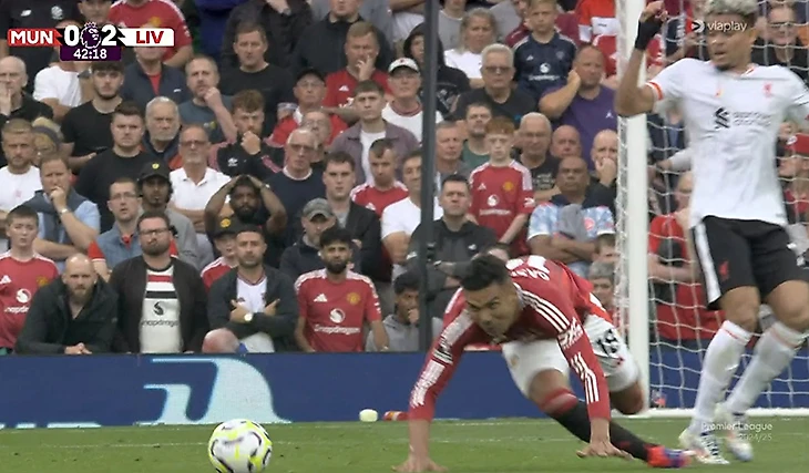 Через несколько минут – новые странности. Каземиро получил мяч в опорной зоне, видел прессинг соперника. Но зачем-то замедлился. «Ливерпуль» не простил: Диас сыграл в мяч, бразилец повалился на газон.