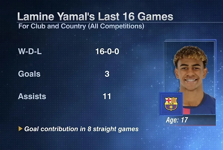 Кроме этого Ямаль на этом отрезке поучаствовал в четырнадцати голевых действиях, а именно трижды забил и одиннадцать раз ассистировал партнерам. Его беспрерывная результативная серия составляет восемь матчей.