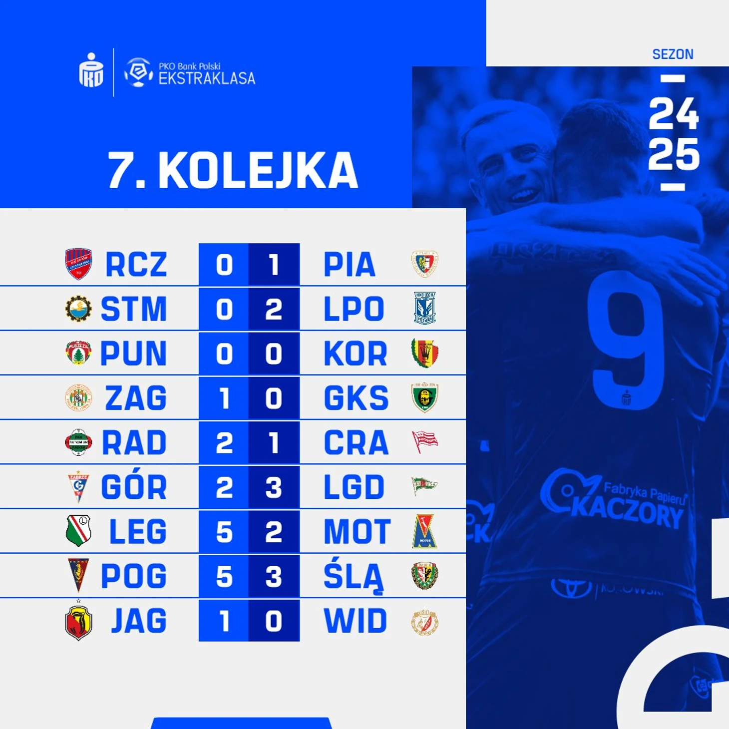 В Любине «Заглембе» одержал минимальную победу 1:0 над катовицким «ГКС», хотя большую часть матча лучше выглядели гости, в прошедшем туре победившие действующего чемпиона страны. А в Кракове «Пуща» и «Корона» голов так и не забили. До восьмидесятой матча лучше выглядели игроки «Короны», но концовка осталась за хозяевами. Радецки нанес два опаснейших удара по воротам Дзеконьского, но вратарь кельчан дважды спас гостей от пропущенных голов.