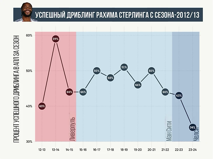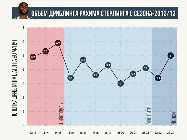 Так или иначе, во время игры в «Челси» Стерлинг значительно сбавил практически во всех статистических метриках. Отчасти это связано с тем, что ему пришлось адаптировать свою игру к новым тактическим требованиям, отчасти – с возрастными ограничениями (совсем скоро ему будет уже 30 лет).