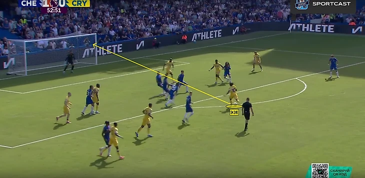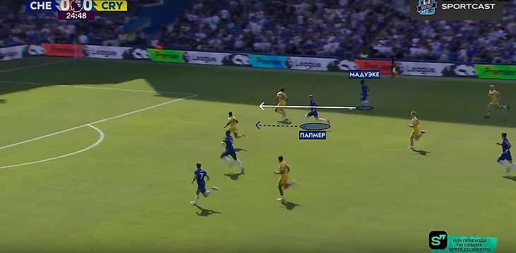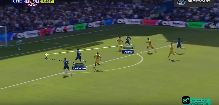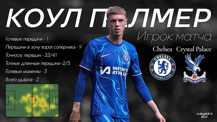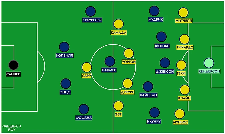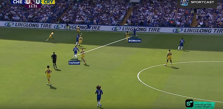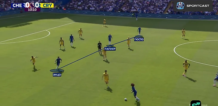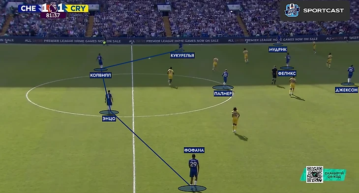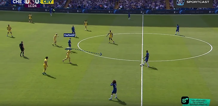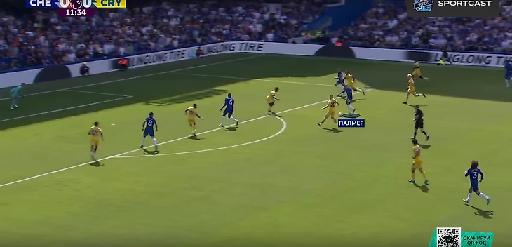 Внезапно вмешалась травма Гюсто. Вместо француза на поле вышел Мудрик. Место в четверке защитников при розыгрыше занял Энцо, а в опорную зону спустился Палмер. «Пэлас» хорошо контролировал центр поля и такая глубинная роль Коула понятна – он и Фернандес будут куда полезнее в начале атаки, чем в завершении (если брать исключительно этот матч).
