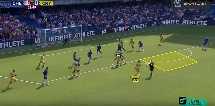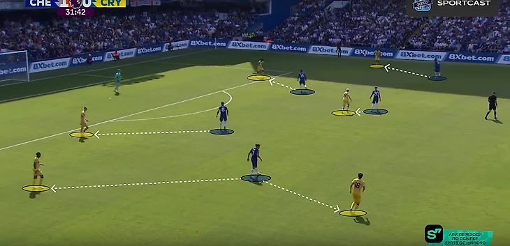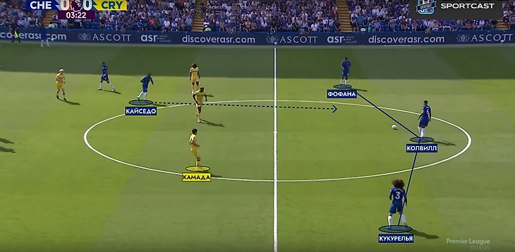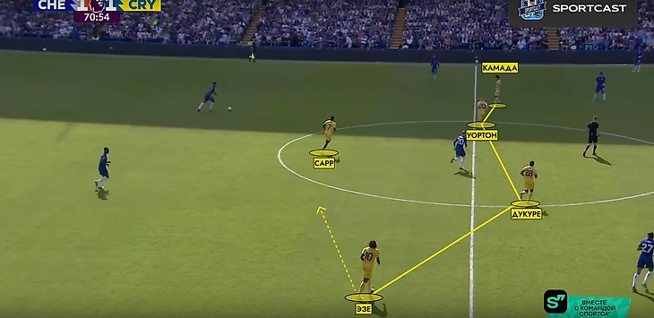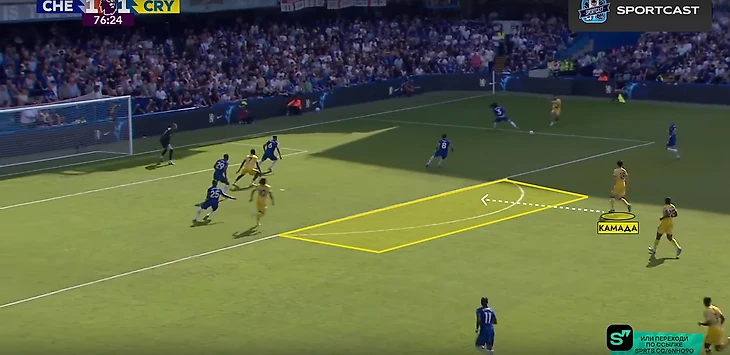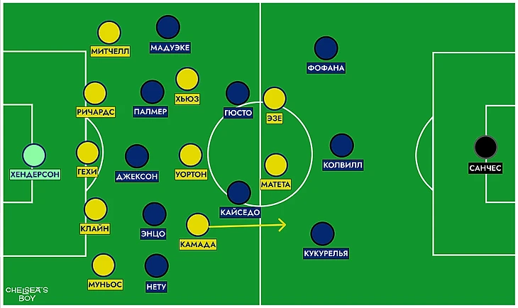 После забитого гола, «Пэлас» перешел на более структурные 5-4-1. Камада поднимался вперед не так часто, единственный кто был в полупозиции – это Эзе. Численный контроль в центре поля перешел к «Кристал Пэлас» - 4 против 3. «Челси» попытался решить эту проблему путем широкой роли у двух крайних защитников – Кукурельи и Фофана.
