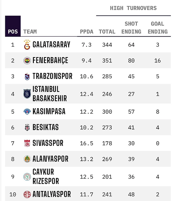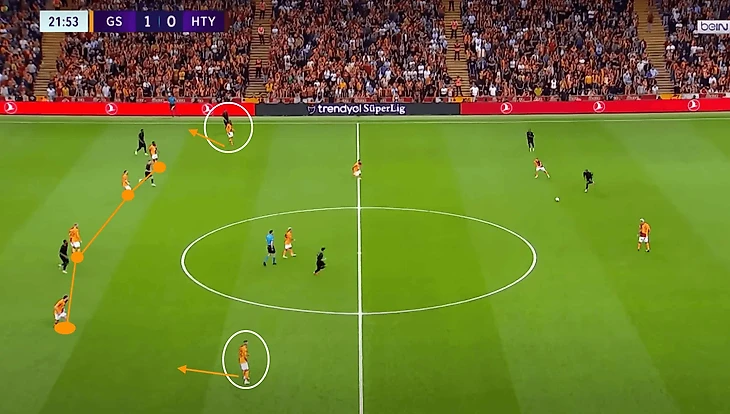 Переход на 4-4-2 без мяча с выдвижением ЦАПа в пару к нападающему позволял «Галатасараю» использовать своих вингеров для прессинга фланговых защитников соперника, чем клуб активно и успешно пользовался, особенно в Супер Лиге. Например, по показателю PPDA (6,46) «Галатасарай» в прошлом сезоне стал лидером среди турецких клубов, равно как и по метрике BDP (Buildup Disruption Percentage), составившей 11,3% и отражающей эффективность прессинга в разрезе влияния на долю точных передач соперника.