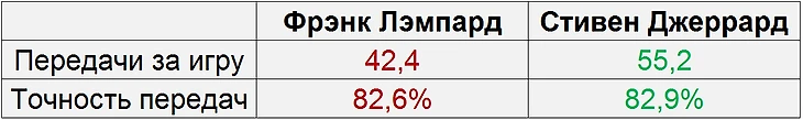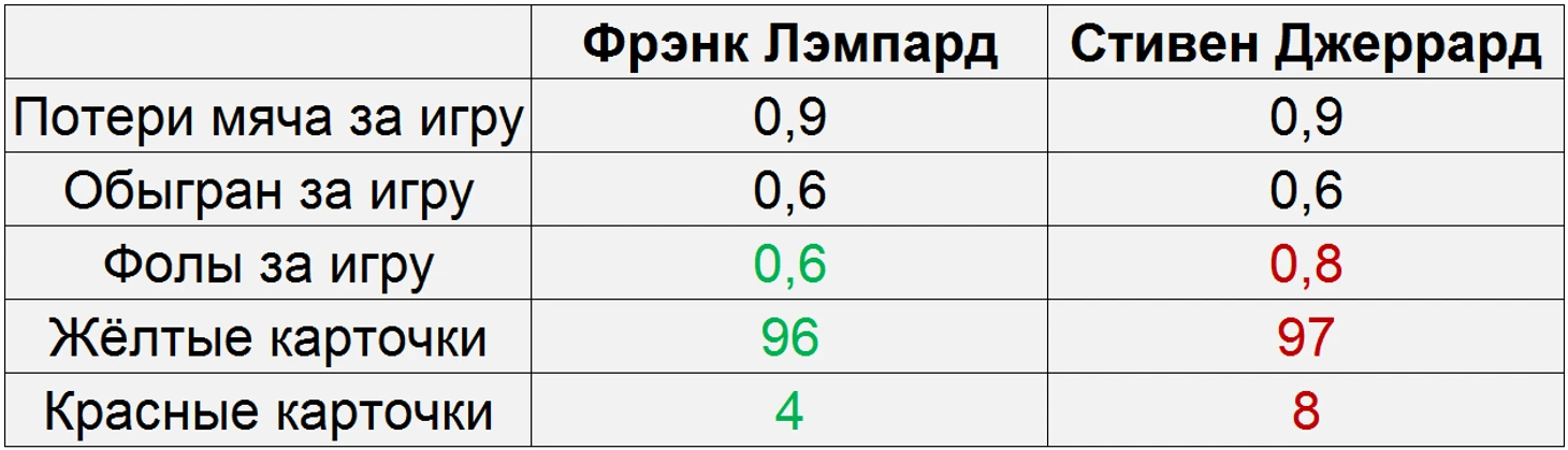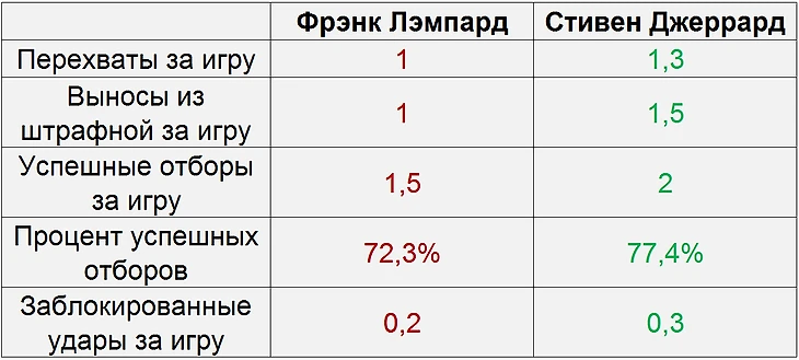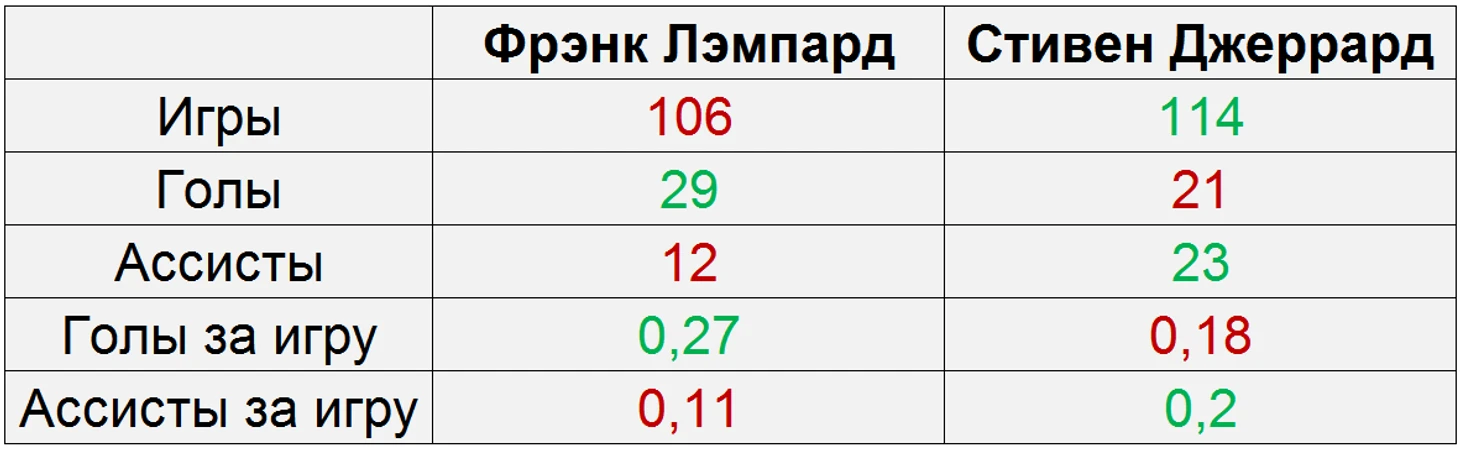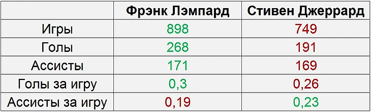 За всю карьеру в Англии и США оба игрока набили превосходные числа в графах «голы» и «ассисты». Количество голевых почти совпадает, а вот забитых мячей у Фрэнка на 77 больше, потому что он играл дольше. Но если посмотреть на средние показатели оформления результативных баллов, то станет ясно, что забивал чаще Лэмпард, а ассистировал Джеррард.