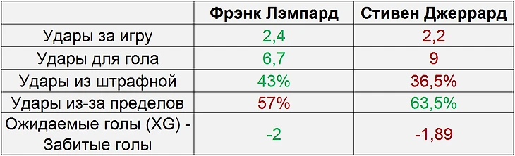 Схожесть ударов этих полузащитников в том, что больше половины из них следовало с дальнего расстояния. Каждый раз, когда они предпринимали попытку угрозы воротам, было ой как опасно. Лэмпс идеально перебрасывал голкиперов, очень часто бил без шансов для них, из-за этого у него немало попаданий в каркас. А вот дальние удары Джеррарда мне напомнили выстрелы из рогатки. Стиви требовалось больше раз нанести удар, чтобы забить, но и бил он издали чаще. По реализации снова получается учесть лишь сезон 2014/2015, который для обоих стал последним на Туманном Альбионе. Как мы видим, разницы почти нет.