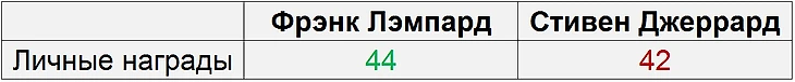 Я долго не мог решить, какой объявить счёт. Но при изучении личных наград я заметил, что как раз Лэмпард является рекордсменом Книги рекордов Гиннесса как футболист, который забил наибольшее количество голов из-за пределов штрафной площади в АПЛ (41). Поэтому победа за Фрэнком.