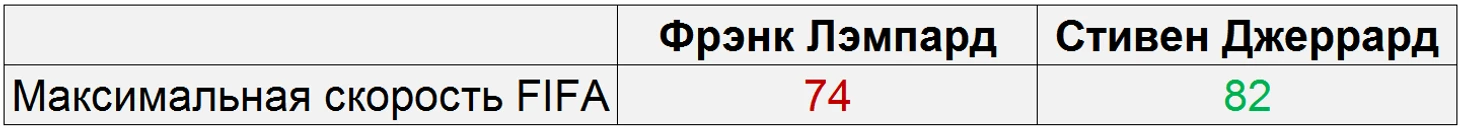Во время просмотра нарезок с их игрой я не лицезрел ни протаскивания мяча на скорости, ни каких-то дальних забегов. Поэтому я просто решил открыть историю карточек в футбольном симуляторе, выписать соответствующие числа и применить к ним операцию сравнения, которой меня научили ещё в первом классе. Джеррард бегал быстрее.