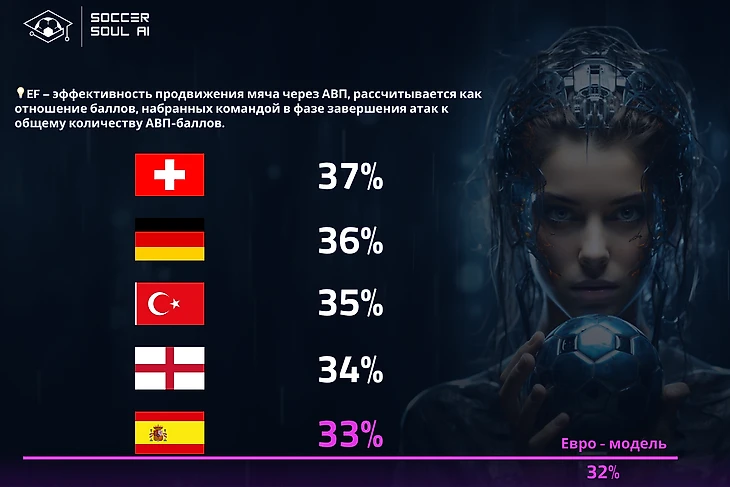 Еще одной важной метрикой успешной игры является процентное соотношение баллов, набранных в фазе завершения атак (удары по воротам) к общему количеству АВП-баллов. Так мы получаем эффективность продвижения мяча (EF). Показатель эффективности испанцев, равный 33% далёк от рекордного, но на это непосредственно влияет игровая стилистика команды со склонностью повозиться с мячом.