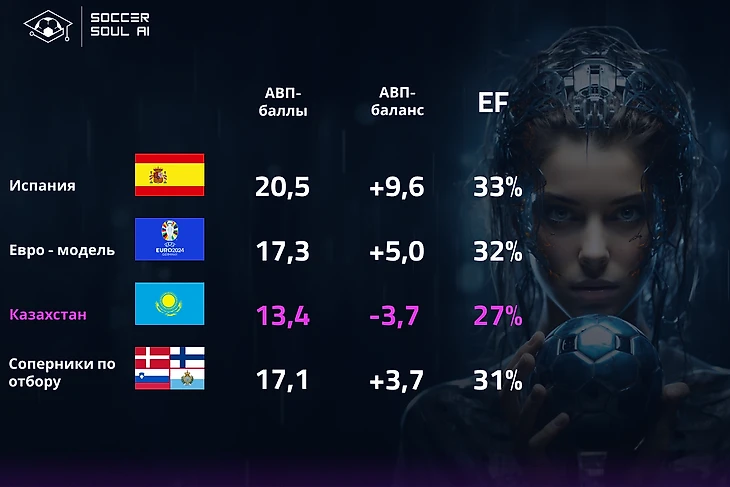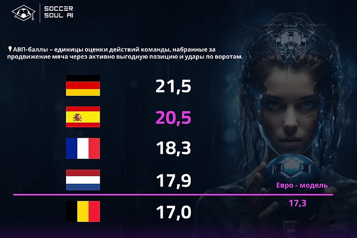 Чемпион Европы сборная команда Испании в личных встречах превосходила соперников (включая статистически сильных по показателям метрик немцев) во всех семи матчах, имея в каждом преимущество по качеству футбола, измеряющееся в АВП-баллах. Итоговый средний показатель команды составил 20.5 баллов.