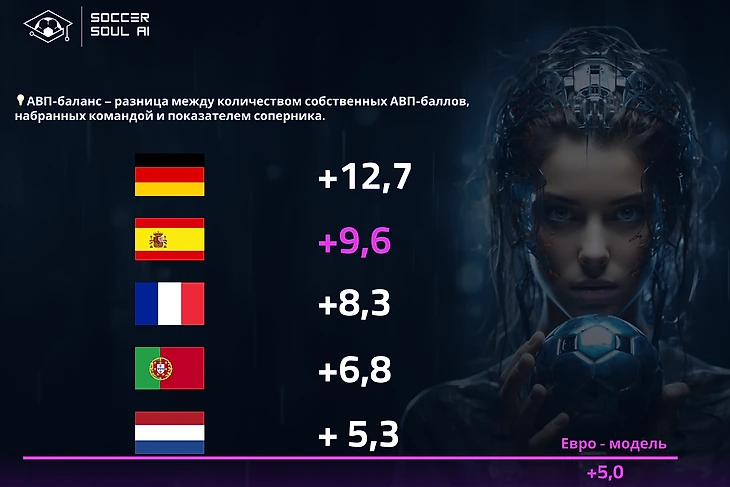 Разность между показателями АВП-баллов двух играющих между собой команд определяет метрика АВП-баланса. Если баланс положительный, то команда имела преимущество в качестве игры. Отрицательный баланс – показатель обратной ситуации. Баланс сборной Испании составил + 9.6 баллов.