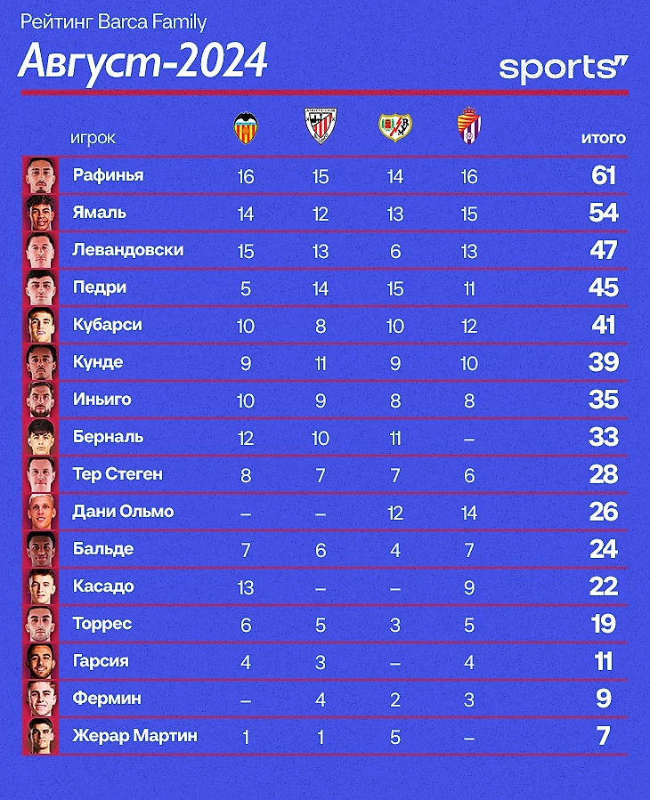 В августе «Барселона» провела 4 матча и одержала победу в каждом из них. Команда Ханси Флика лидирует в Ла Лиги и имеет приличную разницу забитых и пропущенных (13:3).