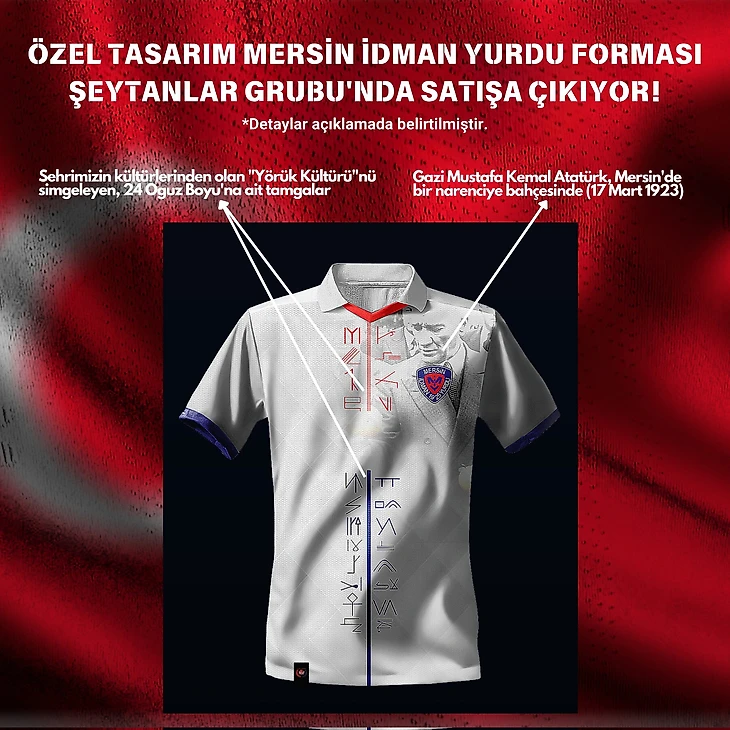 Он выполнен в бело-голубых цветах с изображением достопримечательностей региона: например, виадука Варда с железной дорогой (одна из первых железных дорог за пределами западной части Турции проходила по маршруту «Мерсин – Адана», в связи с чем ж/д транспорт продолжает оставаться важным культурным элементом региона и часто используется в перфомансах фанатов).