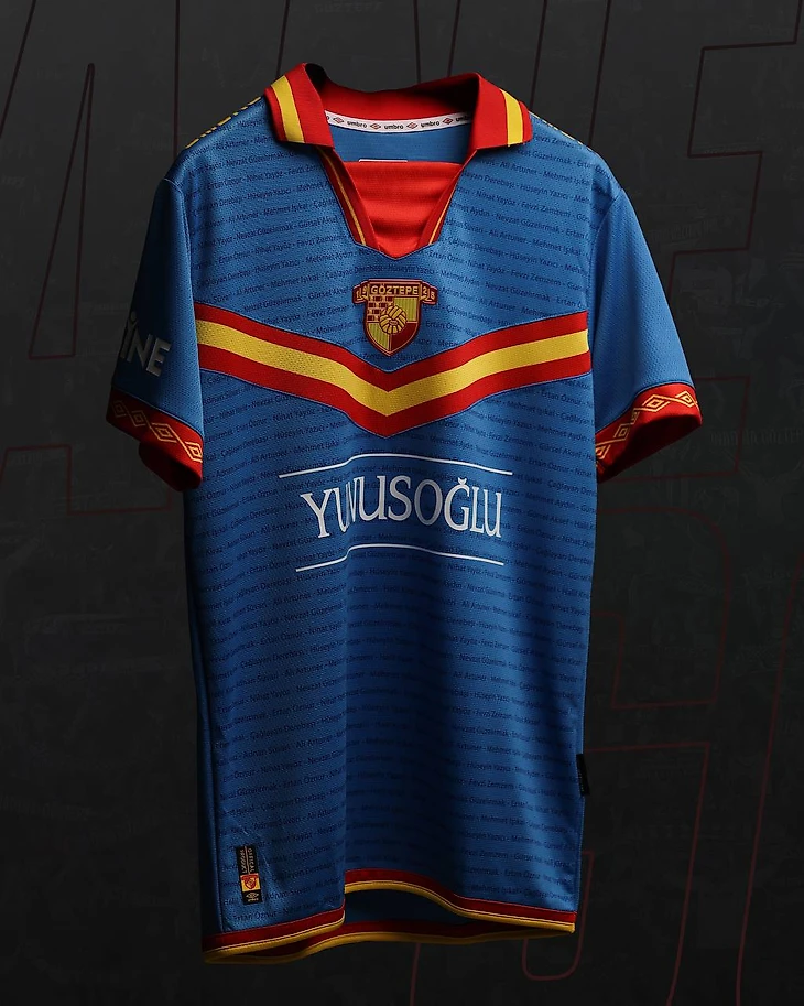 Третья форма «Гезтепе» выполнена в стиле ретро: широченный ворот, эмблема Umbro на манжетах, необычный для клуба синий цвет, V-образная полоса в цветах клуба на груди, лого по центру и имена бывших футболистов команды. Тяжело будет удержаться и не приобрести ее, когда окажусь в Измире на «Стадионе имени Гюрселя Акселя».