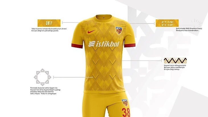 Основной паттерн желтой джерси — восьмиконечная звезда Сельджуков. Пожалуй, это главный символ государства на территории современной Турции начала второго тысячелетия после двуглавого сокола. Как отмечает клуб, Кайсери являлся второй столицей государства, чем и обусловлена инкорпорация эмблемы в форму.
