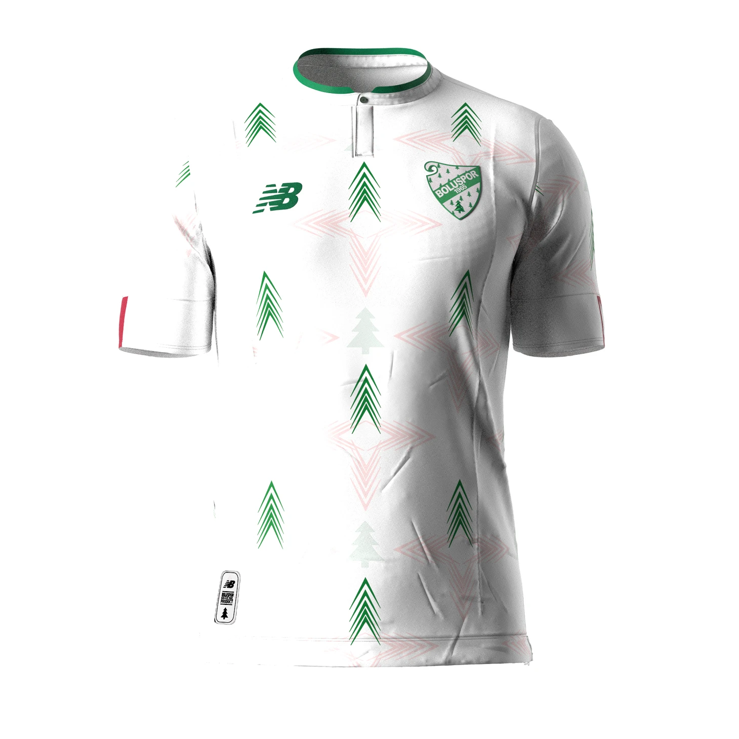 На третьей футболке «Болуспора» еле заметные ели, зеленые треугольники, отсылающие к еловым иголкам, а также красные элементы, корреспондирующие с одним из основных цветов логотипа.