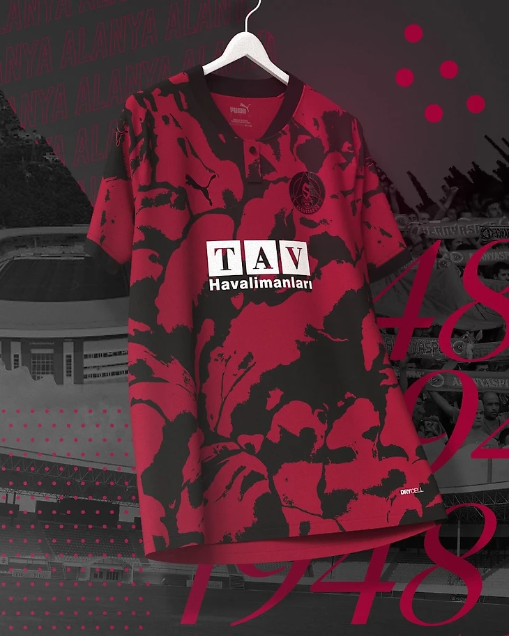«Аланьяспор» всегда старается креативно подходить к дизайну хотя бы одной из своих футболок на новый сезон и последний релиз не стал исключением. Ранее не использовавшийся клубом цвет, интересный узор, напоминающий то ли мазки кисти, то ли листья растений, выполненный в цветах футболки логотип команды – стиль.