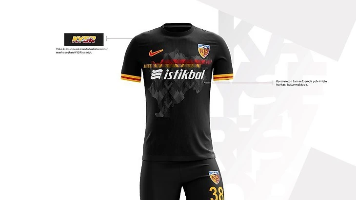 Главный мотив черного комплекта — карта города Кайсери. Она расположена прямо посередине на самом видном месте, при этом также выполнена в паттерне Сельджукской звезды. Пересекают карту две линии желтого и красного цвета. Сзади на воротнике — выполненная в цветах клуба, желтом и красном, аббревиатура-сокращение KYSR. Манжеты тоже в цветах «Кайсериспора» с преобладающим желтым цветом.