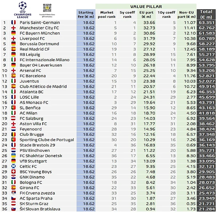 Народные умельцы из Football Meets Data подсчитали приблизительных доходы каждого из тридцати шести участников лиговой фазы Лиги чемпионов.