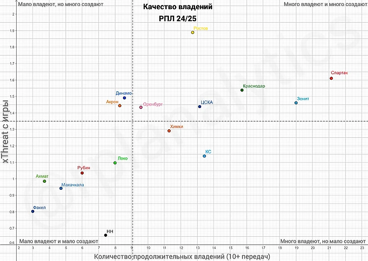 Тут многие точки лежат на одной линии и это логично – ожидаемая угроза пропорциональна количеству владений. Немного отходят от этого «Динамо», «Акрон» и «Оренбург» – команды любят быстро действовать в переходных фазах и играют вертикально.