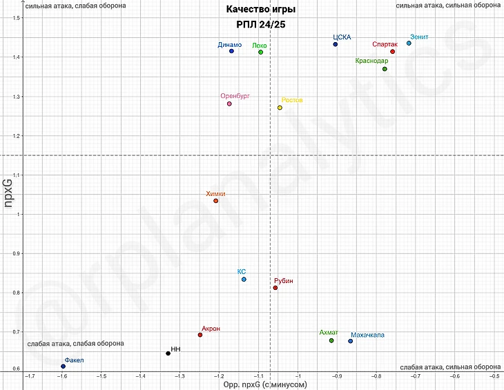 Положение «Акрона» хорошо характеризует игру команды – почти по всем метрикам они пытаются играть смело, но сильно проседают в качестве.