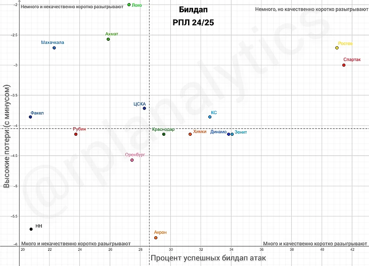 «Ахмат» и «Махачкала» стараются использовать длинные передачи и допускают мало потерь на своей половине. «Локомотив» успешнее всех в плане потерь, при этом качество билдапа у команды почти на уровне среднего.