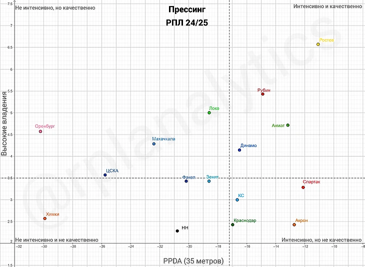 Тут оценка объёма специфична, ведь количество потерь напрямую зависит от стиля соперника. В этом смысле «Ростов» и «Спартак» допускают мало потерь в том числе и потому, что их реже прессингуют. То есть проходить давление на своей половине этим командам приходится меньше, учитывая соотношение успешных билдап атак и «высоких» потерь. Чуть большее число потерь с тем же процентом успешных атак считалось бы более качественными цифрами, но в сравнении с остальными командами они всё равно самые успешные.